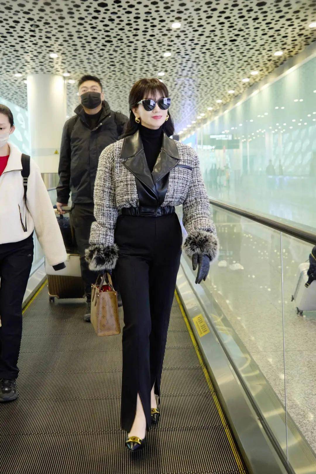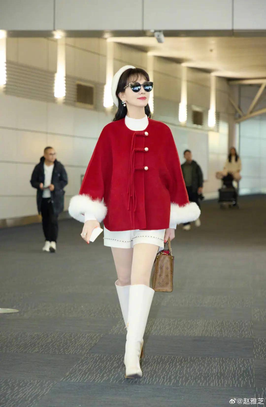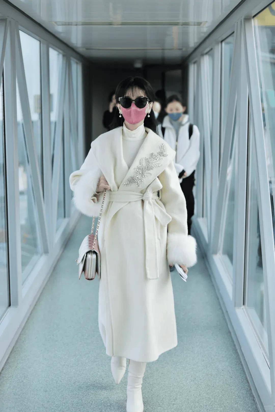 生活中,她会把新中式穿得松弛可爱,这身红色斗篷外套,胸前点缀珍珠盘扣,戴上小圆帽,搭配白色短裤和长靴,行走在机场,醒目又舒适,凸显个人风格。