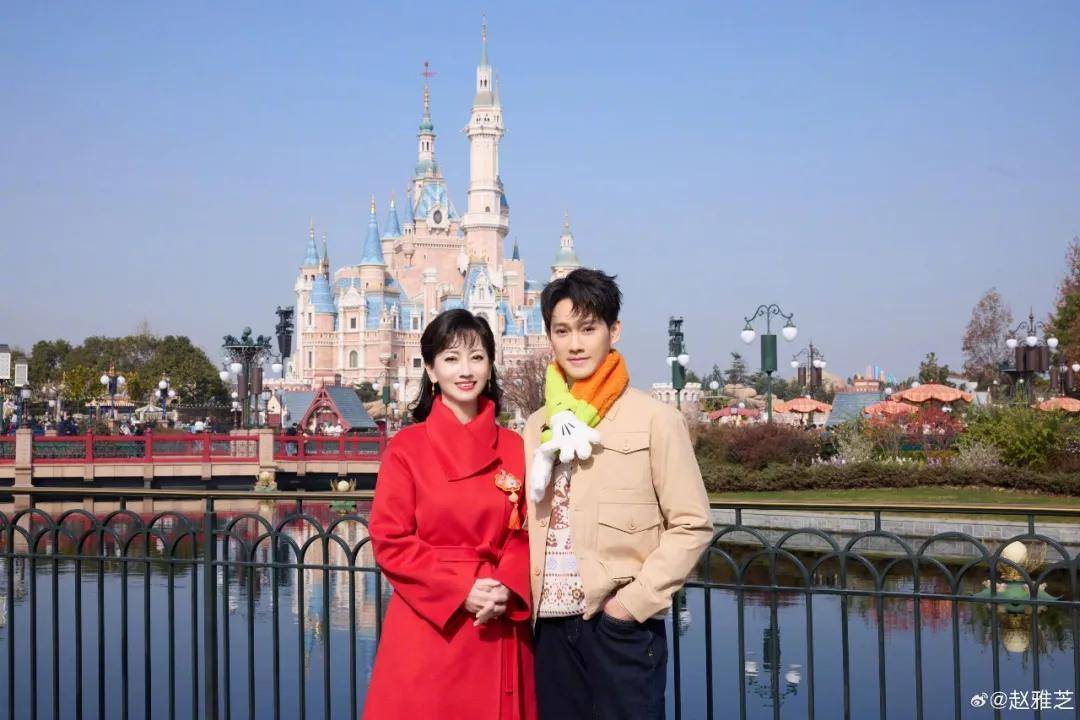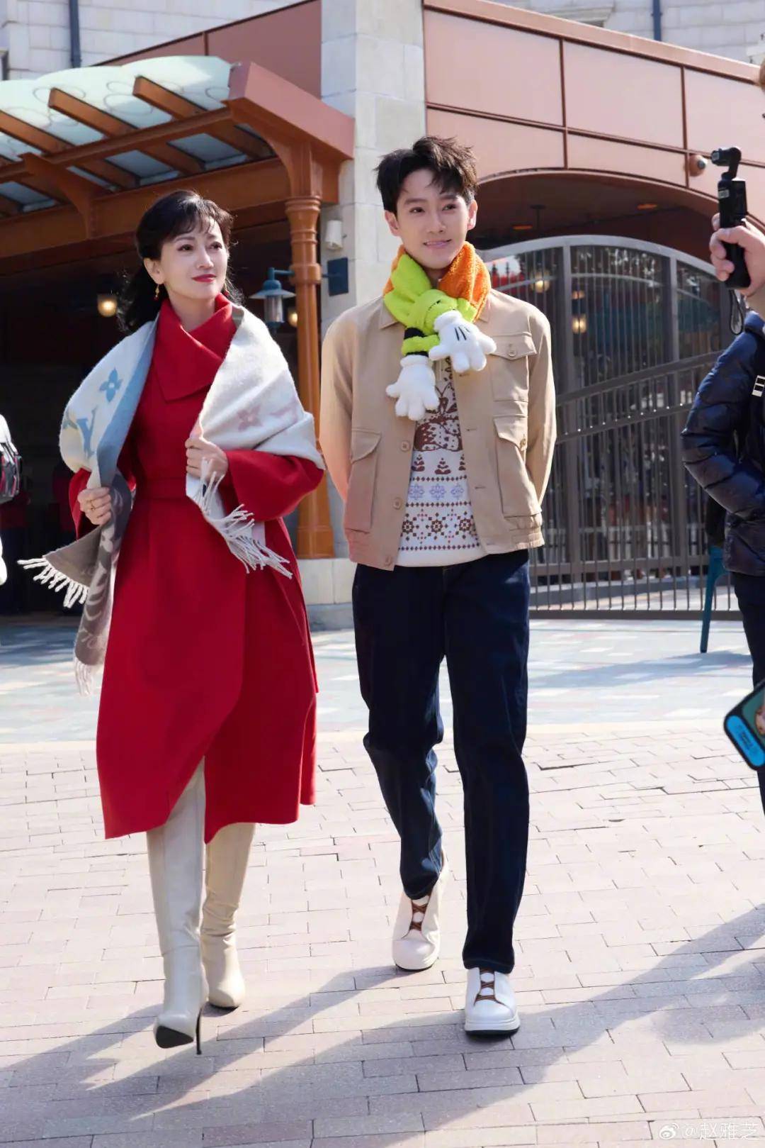 身穿GIADA Amber双层羊绒红色大衣,和儿子黄恺杰一同亮相迪士尼,搭配白色长筒靴,两人站在一起像是姐弟。