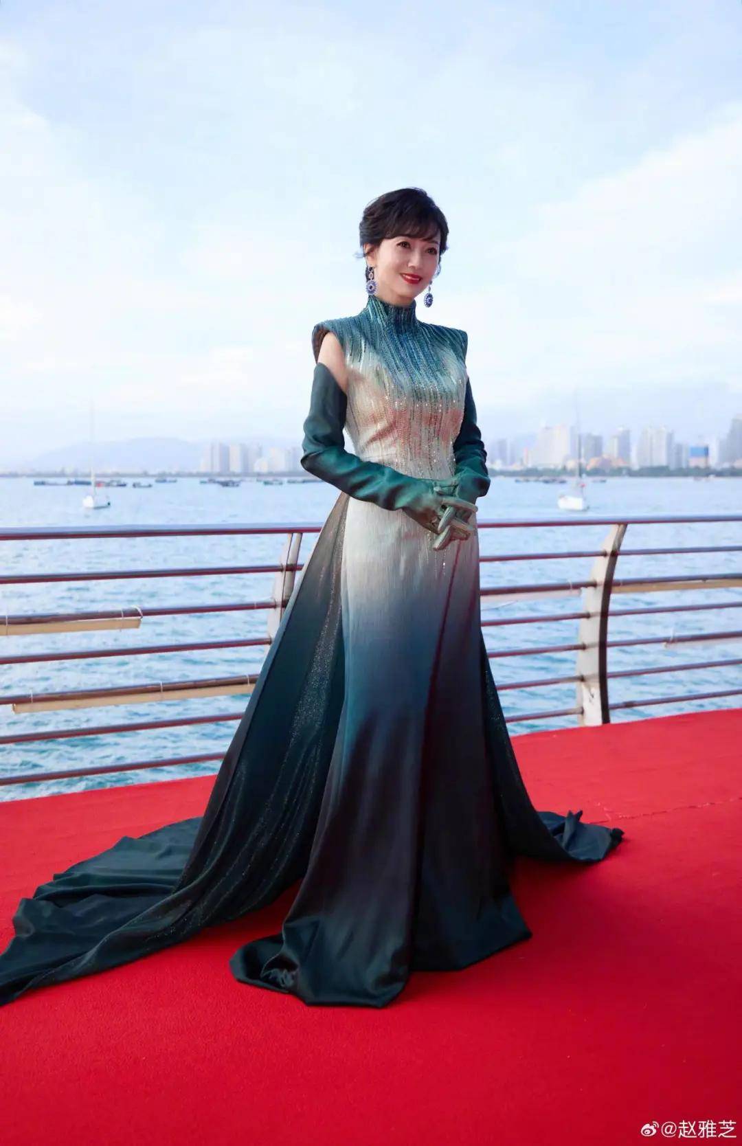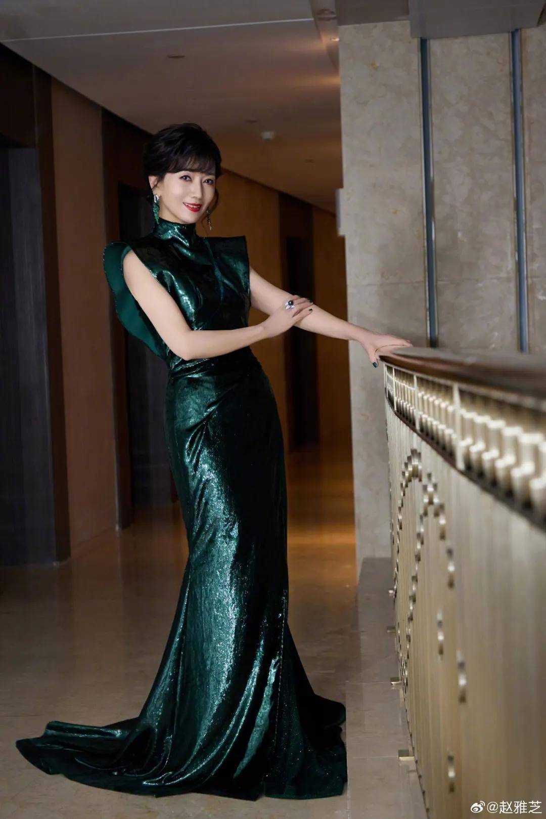 一身青绿色长礼服,让她宛如孔雀公主。
