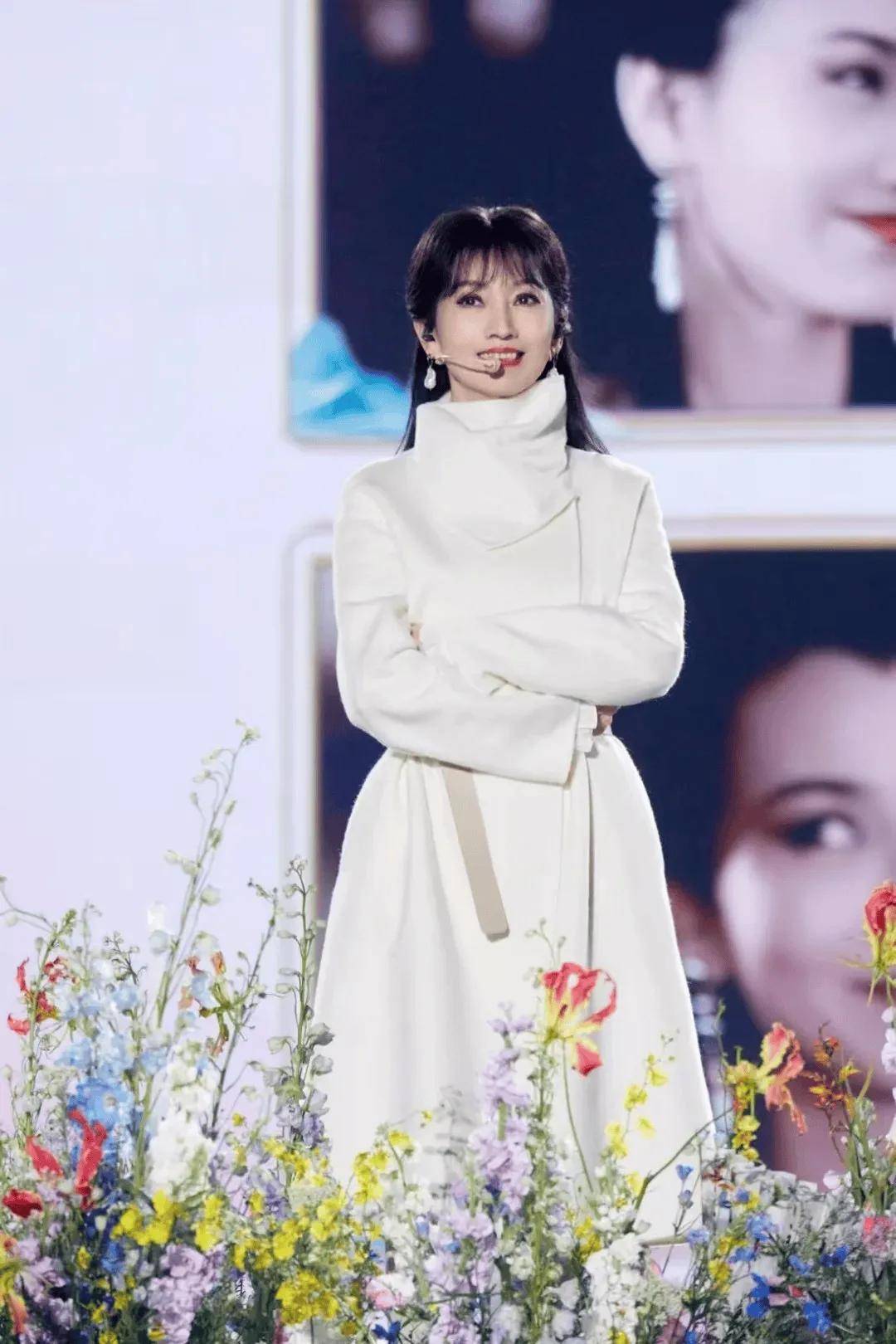 身穿白色GIADA羊绒大衣登台表演,优雅的花苞领凸显天鹅颈,让人梦回白娘子。