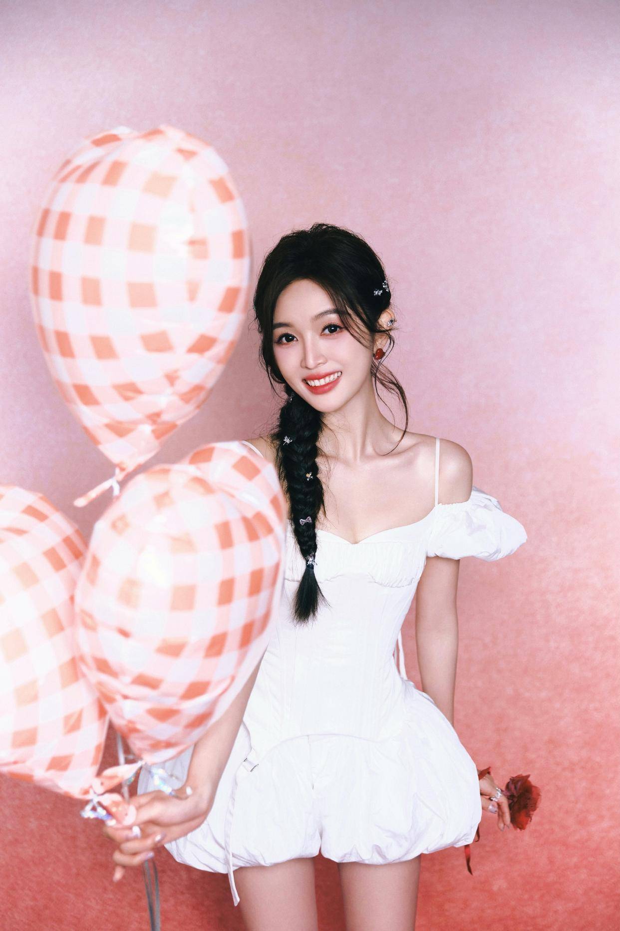 在这组图片中,吴宣仪化身为爱心天使,整体造型甜美又俏皮,让人仿佛置身于浪漫的童话世界中。她身着一套极具特色的白色套装,展现出了独特的时尚品味。