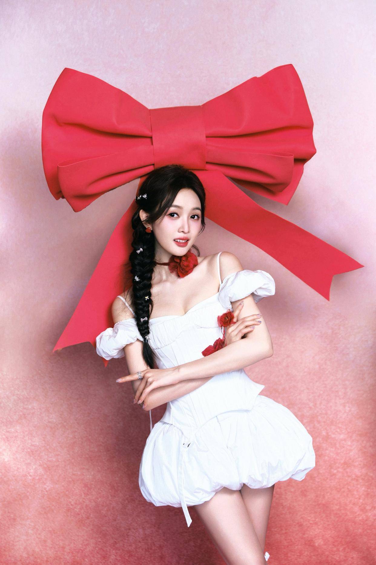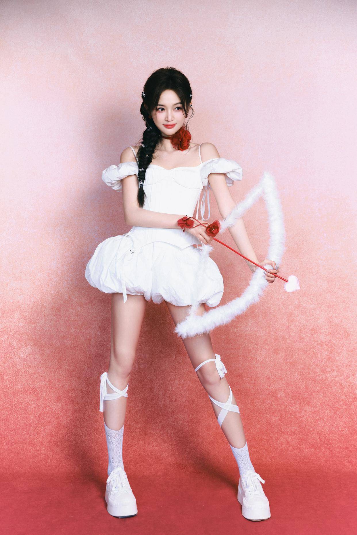 在配饰方面,吴宣仪搭配得十分巧妙。她手持一个毛茸茸的爱心形状的道具弓箭,红色的箭身与白色的套装形成鲜明的对比,不仅呼应了爱心天使的主题,还为整体造型增添了一抹亮眼的色彩。脖子上和手腕上点缀的红色花朵配饰,与手中的道具相呼应,增加了造型的整体感和协调性。