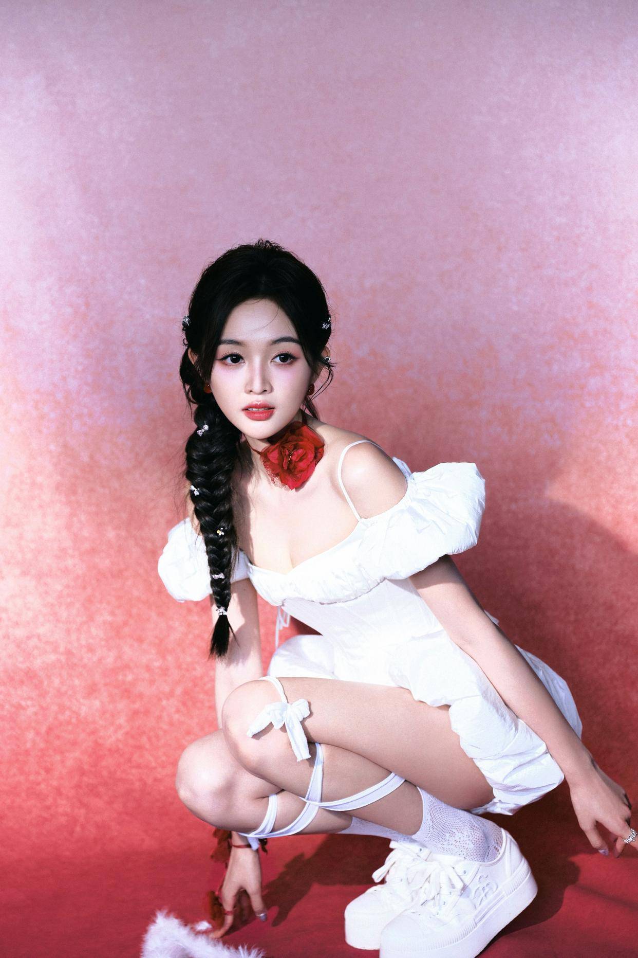脚上穿着一双白色的厚底运动鞋,搭配着绑带设计的白色长袜。厚底鞋不仅增加了身高,还让整体造型更具时尚感和街头感,而长袜的绑带设计则为造型增添了一些个性元素,使甜美中又带有一丝帅气。